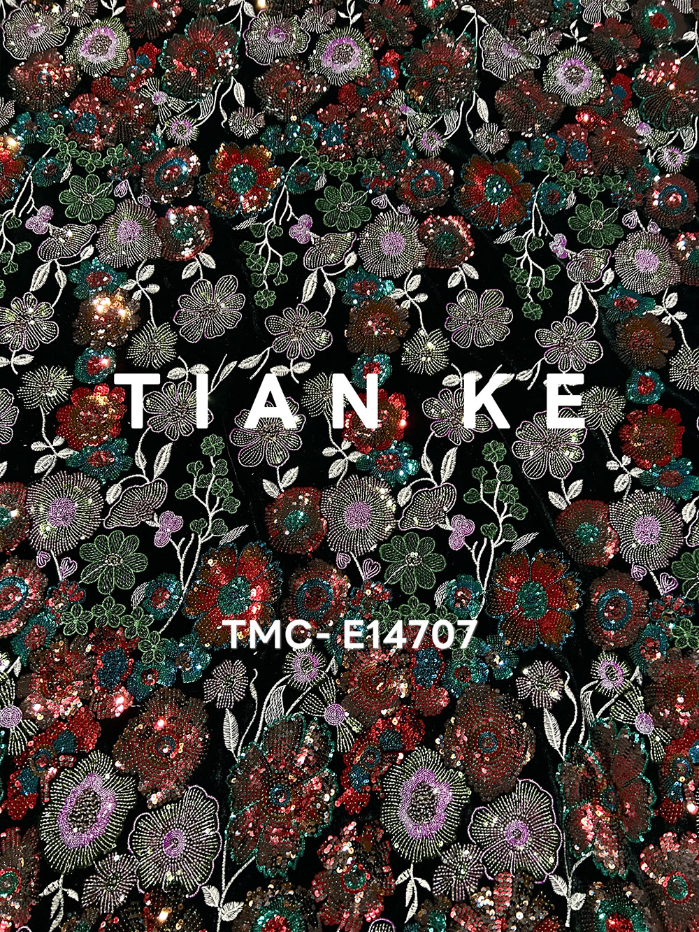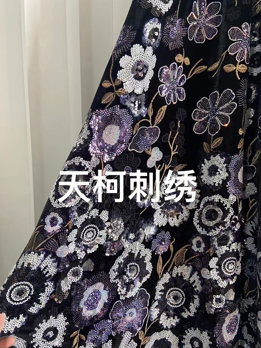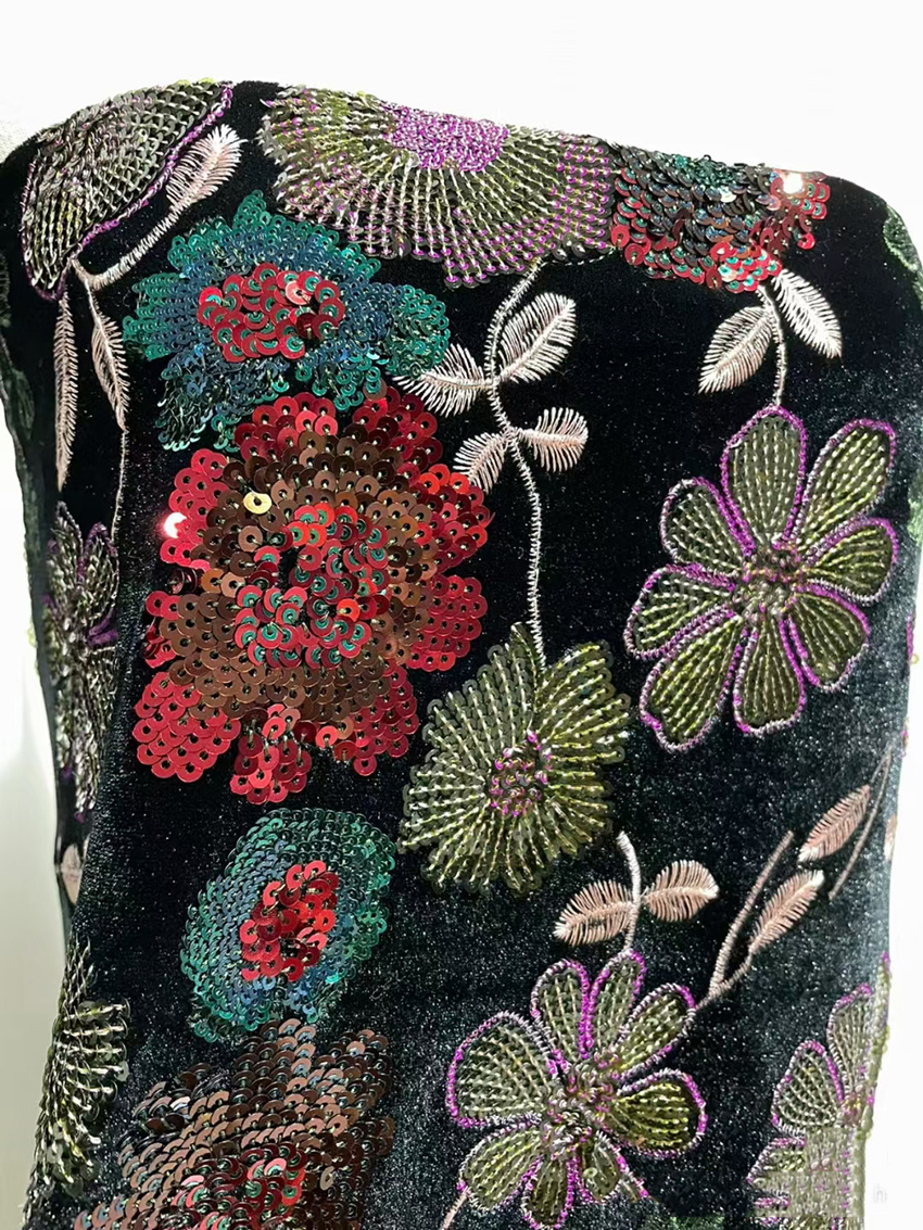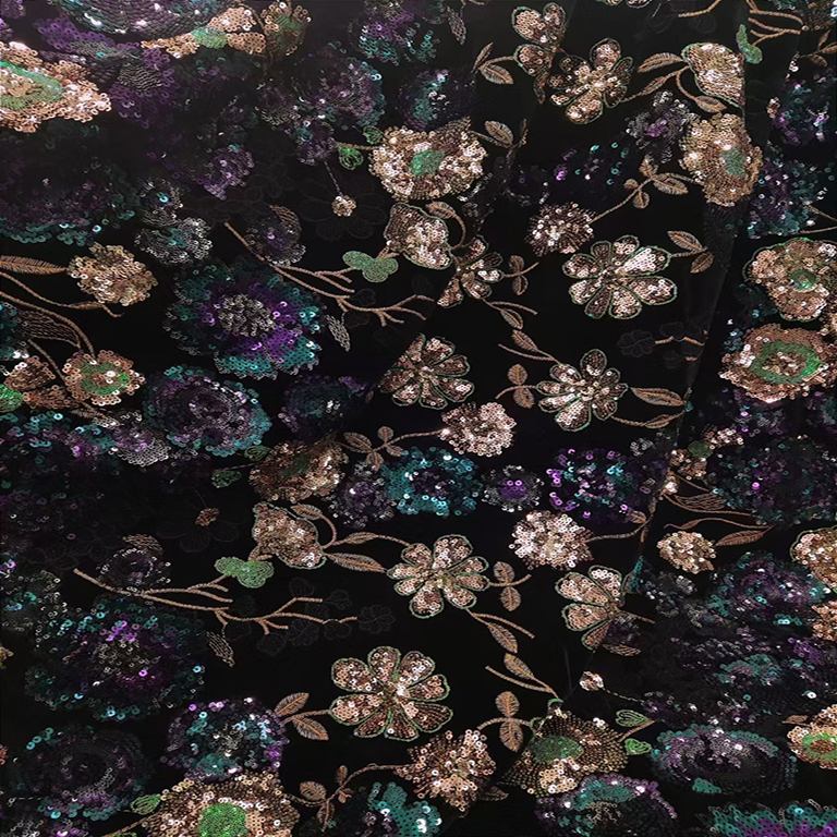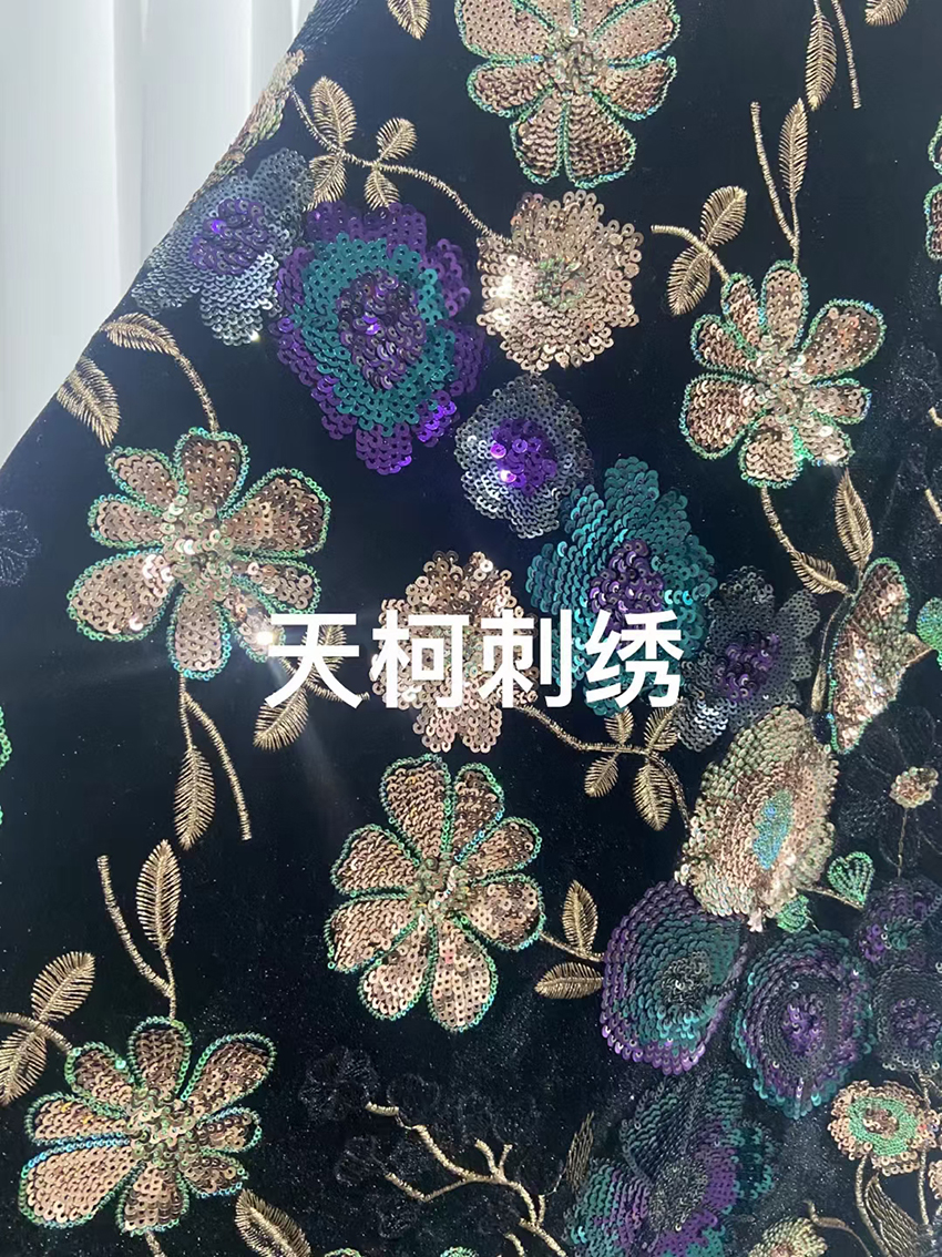 (TMC-E14707) Heavy Sequins Flower Of Multi Color Embroidered On Black Kitting Velvet Fabric