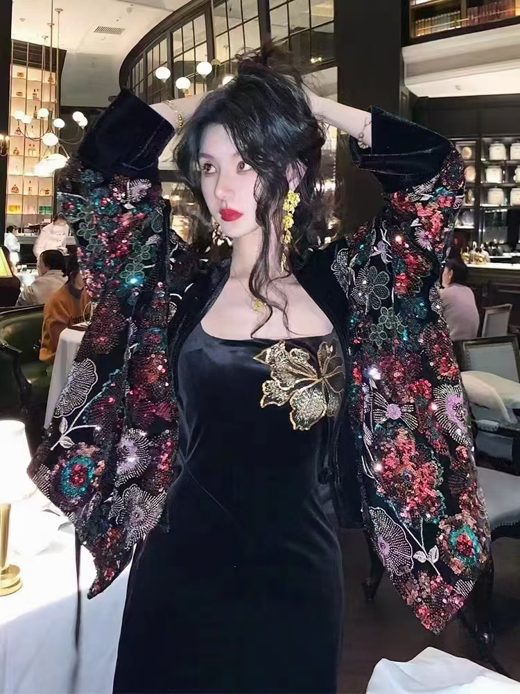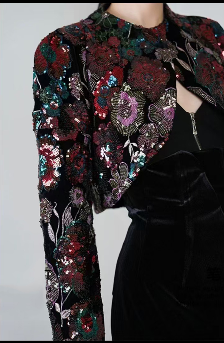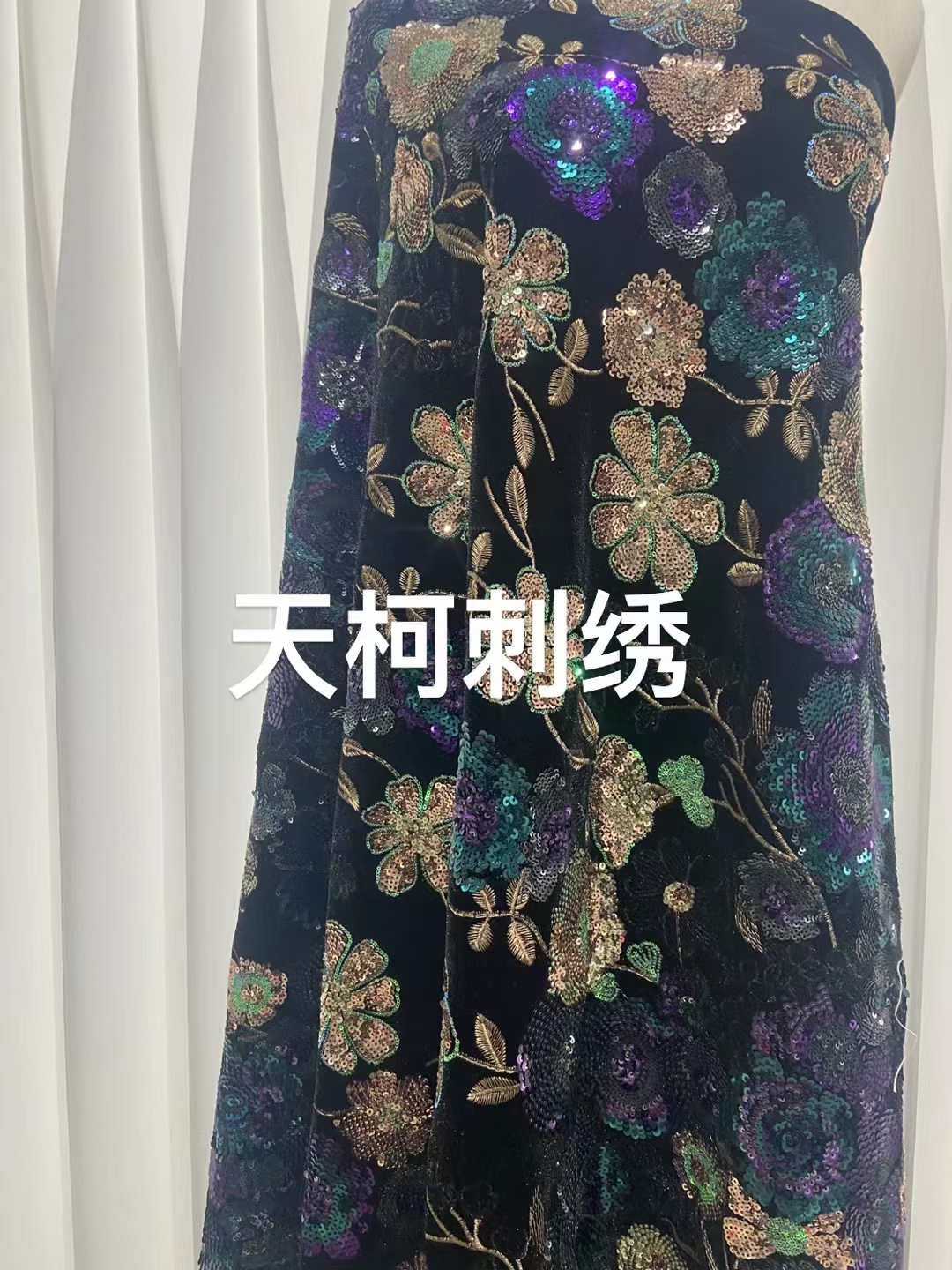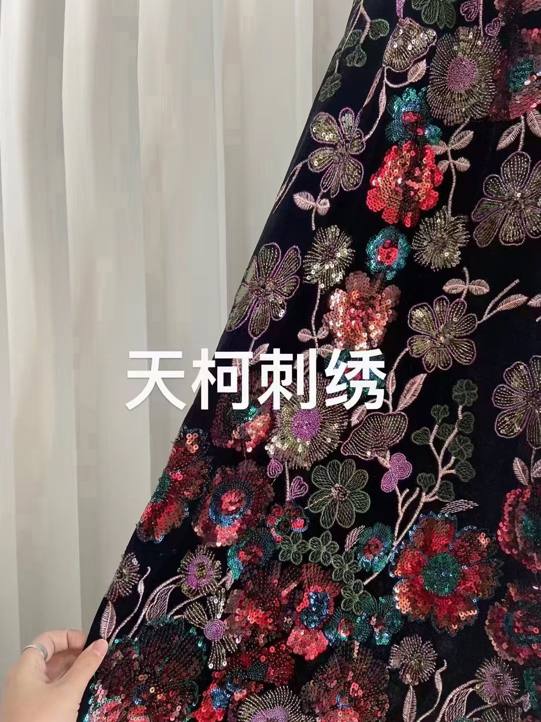 (TMC-E14707) Heavy Sequins Flower Of Multi Color Embroidered On Black Kitting Velvet Fabric