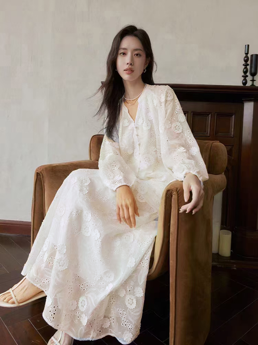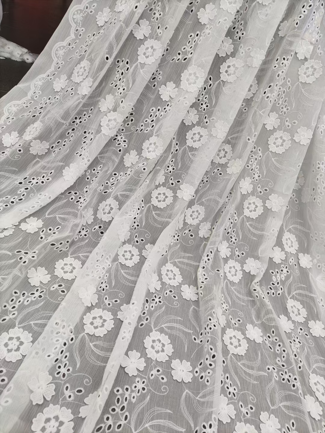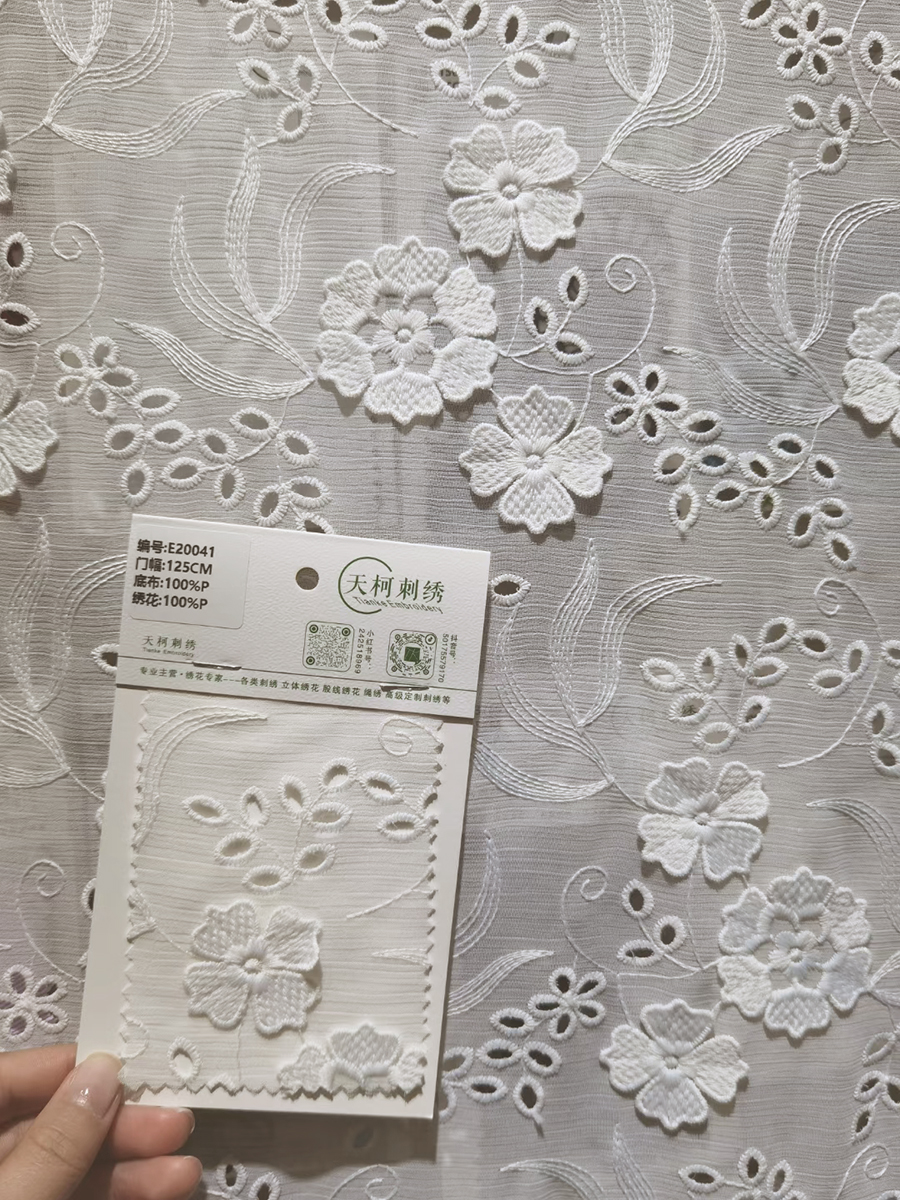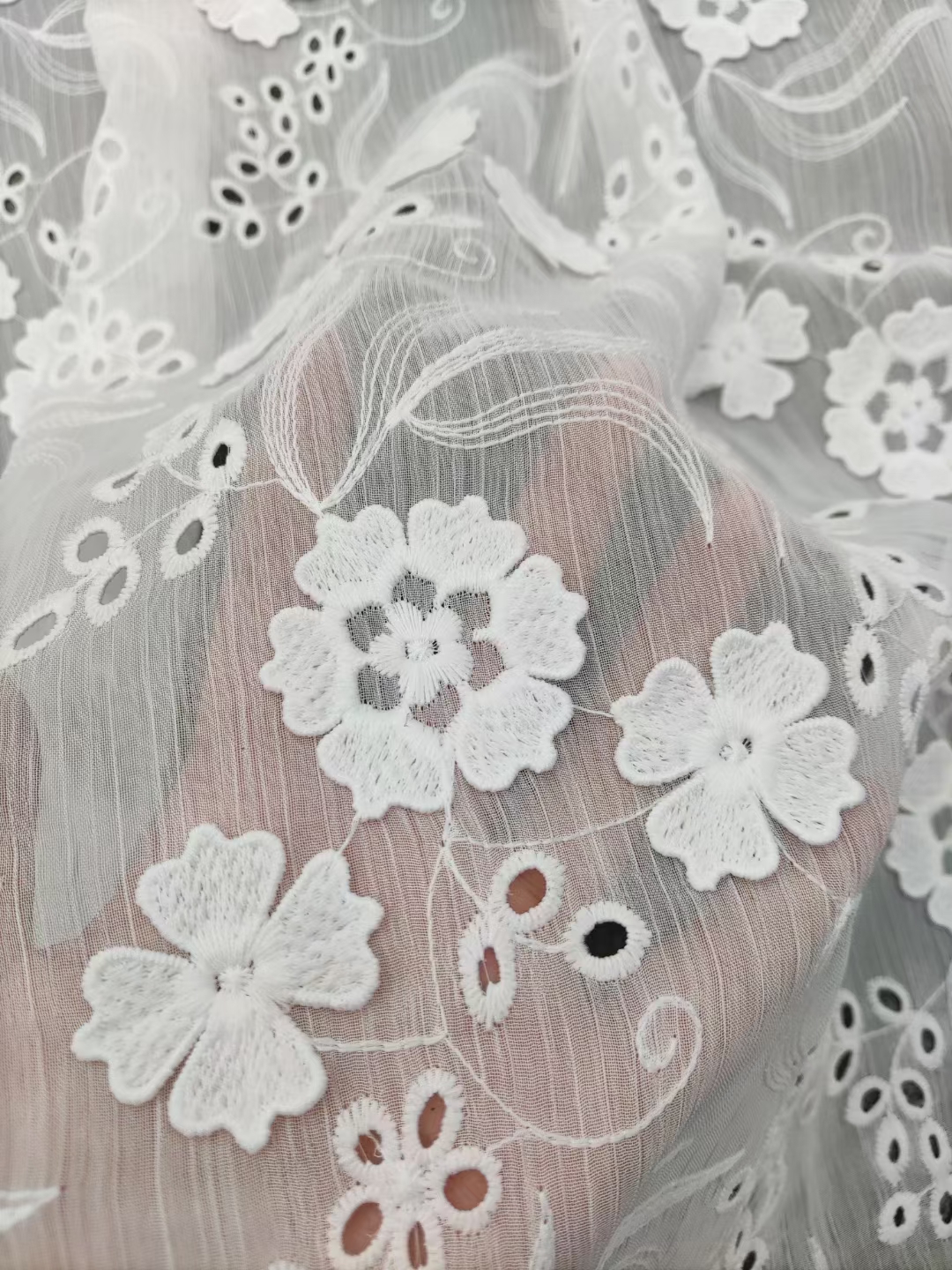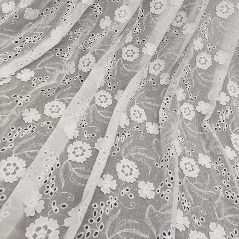 (TMC-E20041) White 3D Flower Embroidered on White Polyester Chiffon Yoryo Fabric