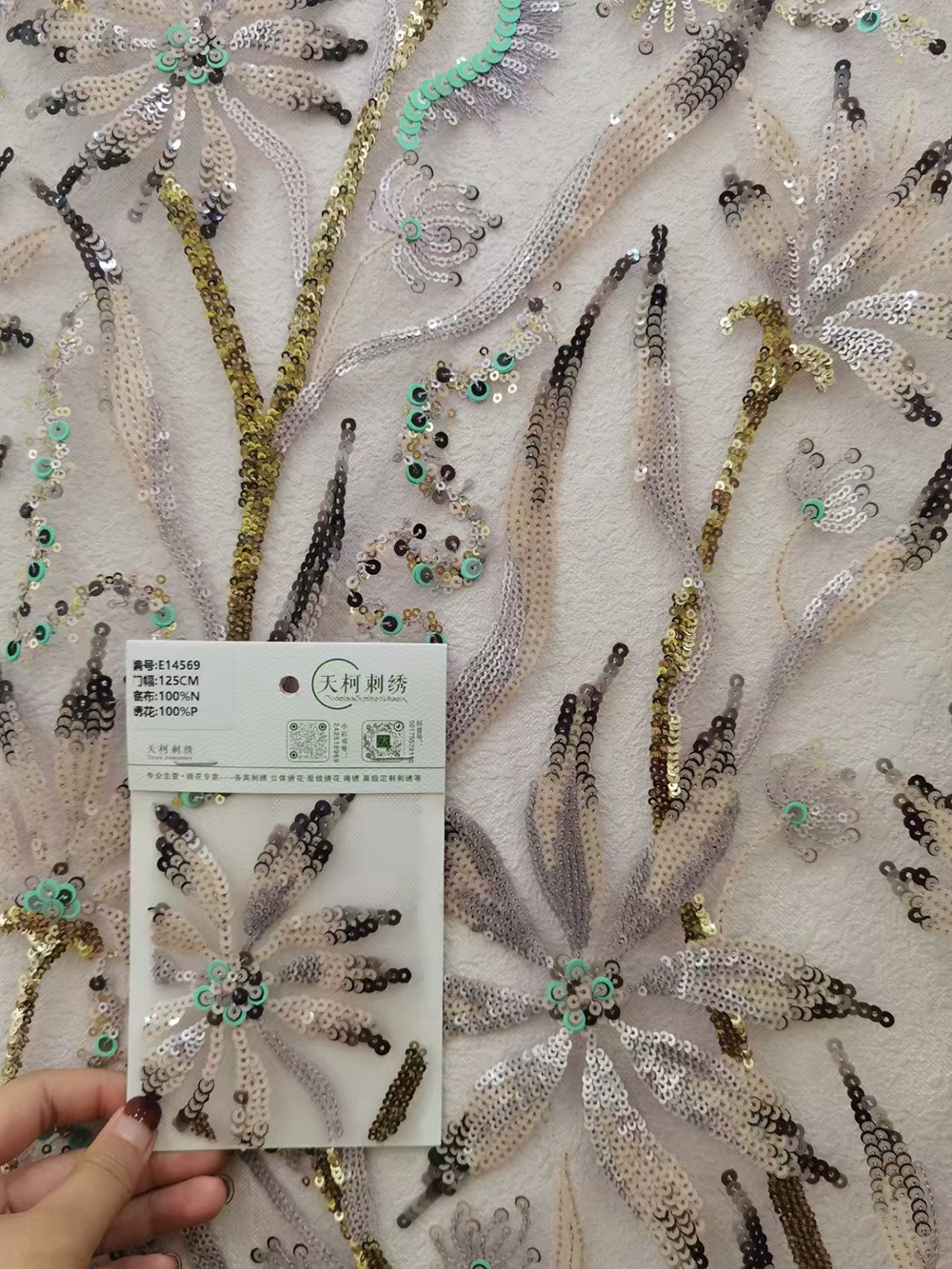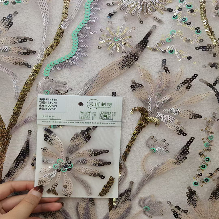(TMC-E14569) Spreaded Sequins Flower Embroidered on Nylon Tulle Mesh Base Fabric