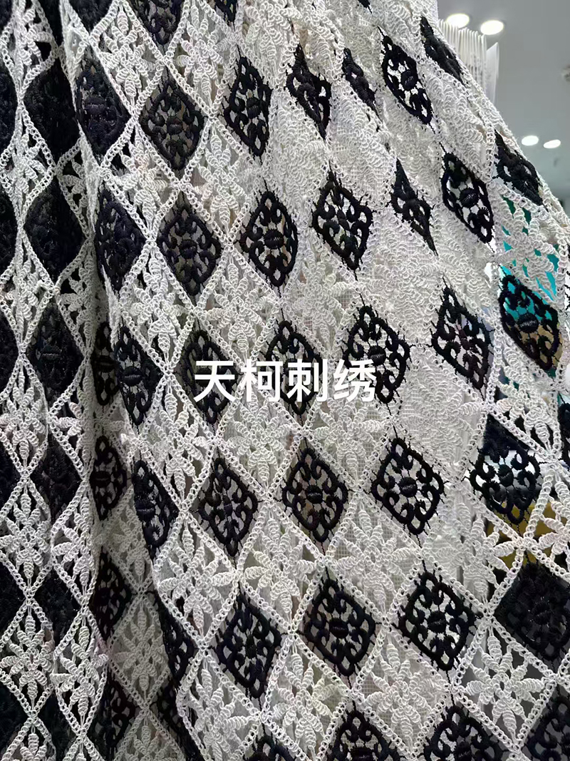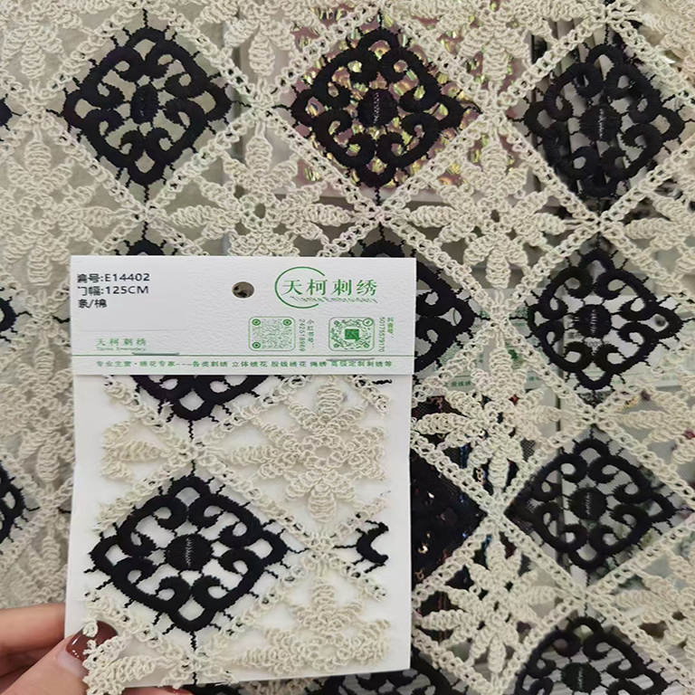 (TMC-E14402) Thick Cord Yarn Cotton Embroidered with Semi-Shinny Milky Yarn In Geometrical Pattern