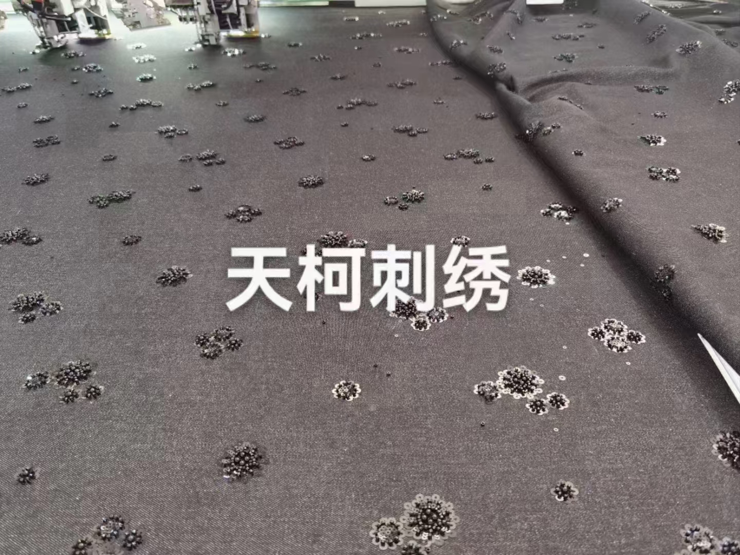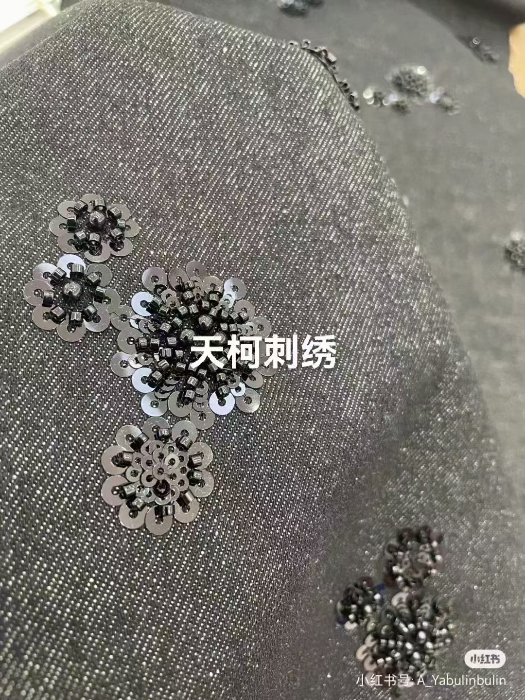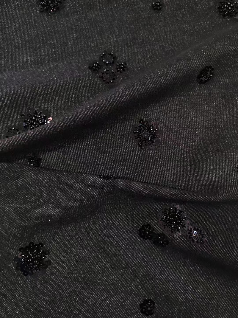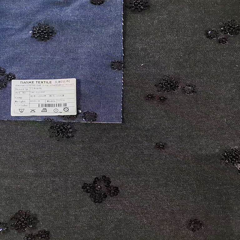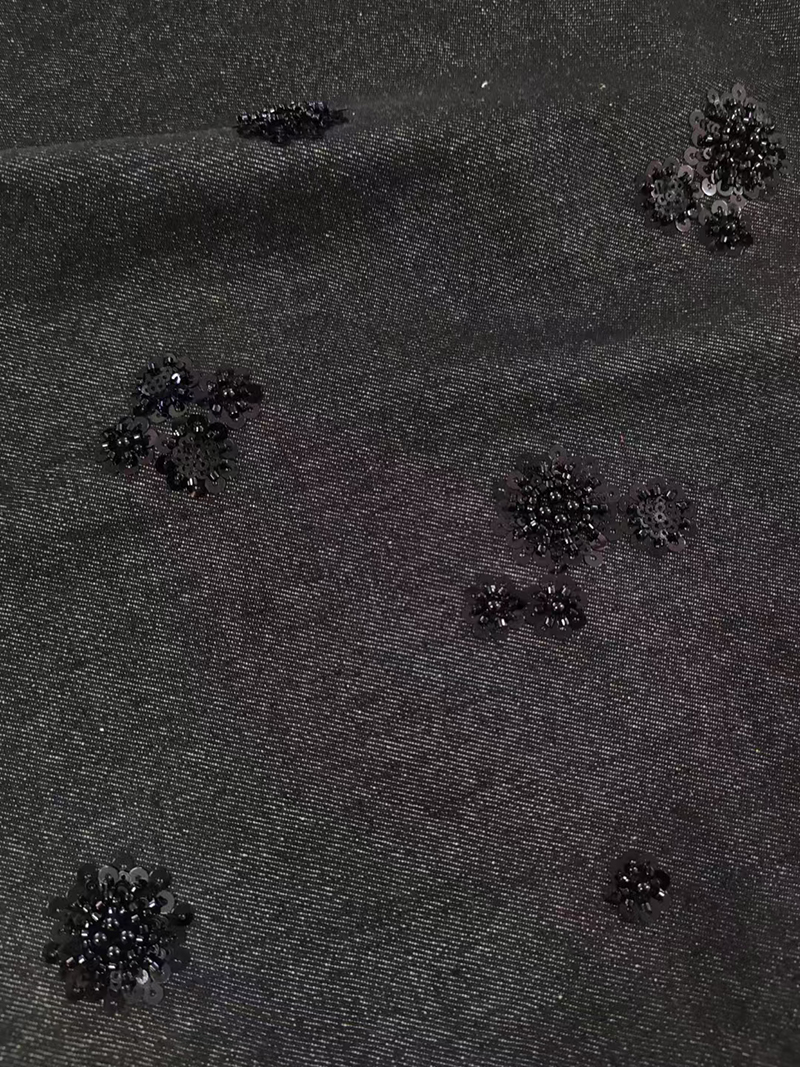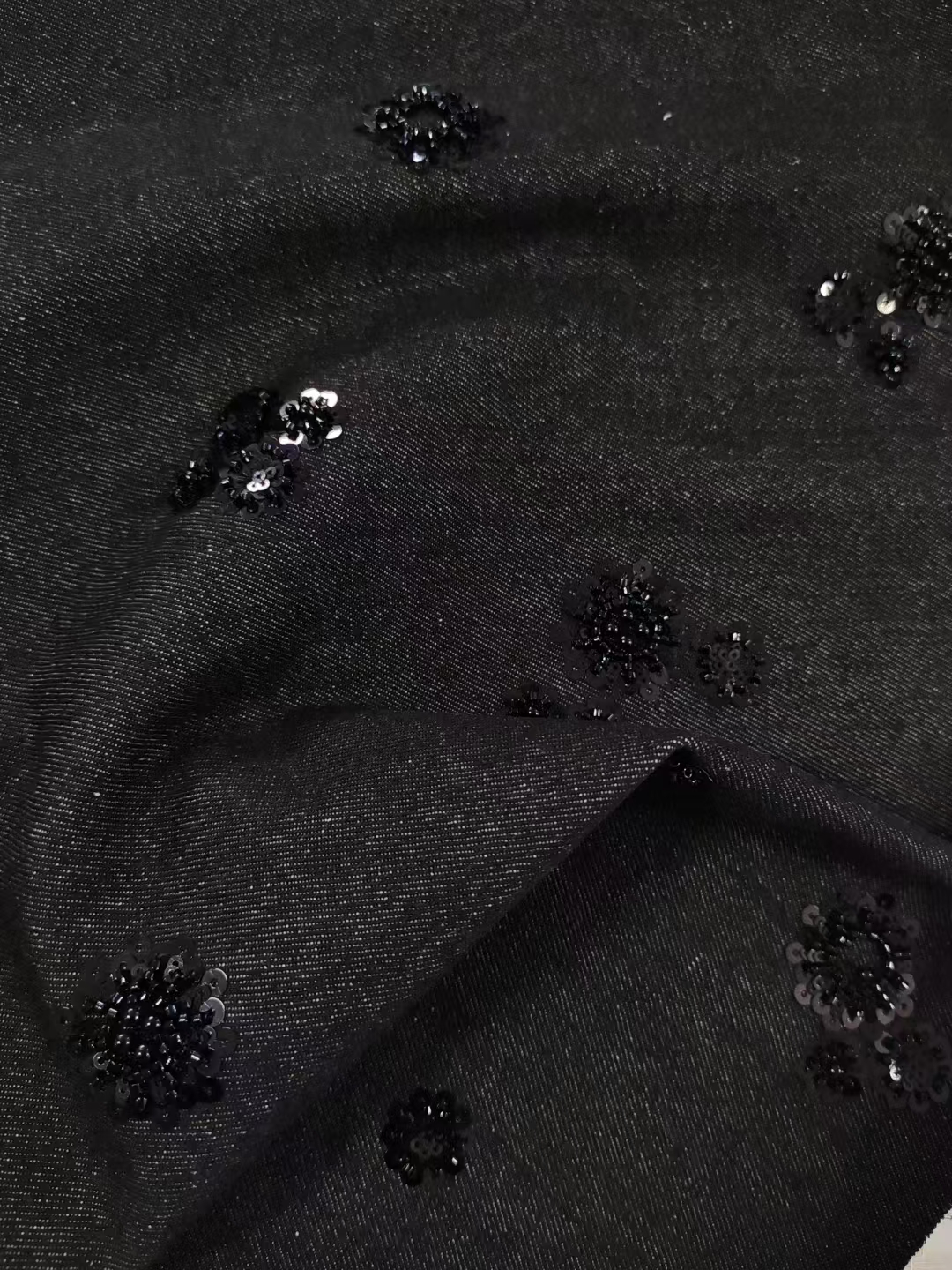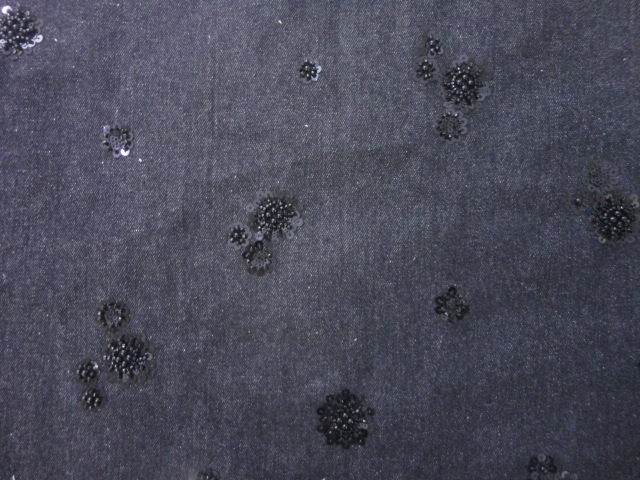 (TMC-E21605) Little Flower Consisted of Beadings & Sequins Spread over on Cotton Denim Fabric