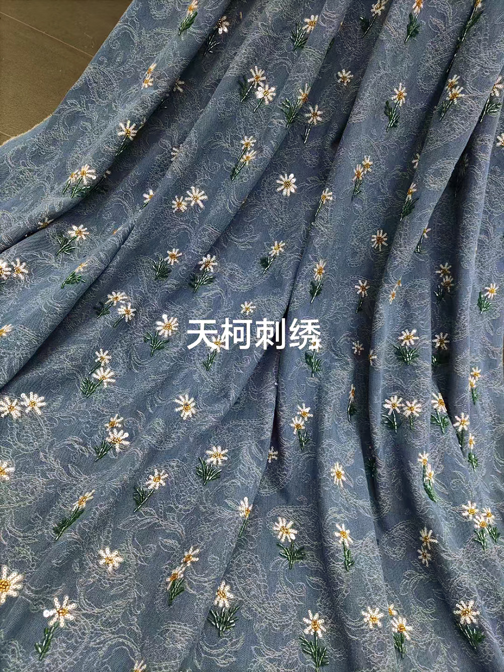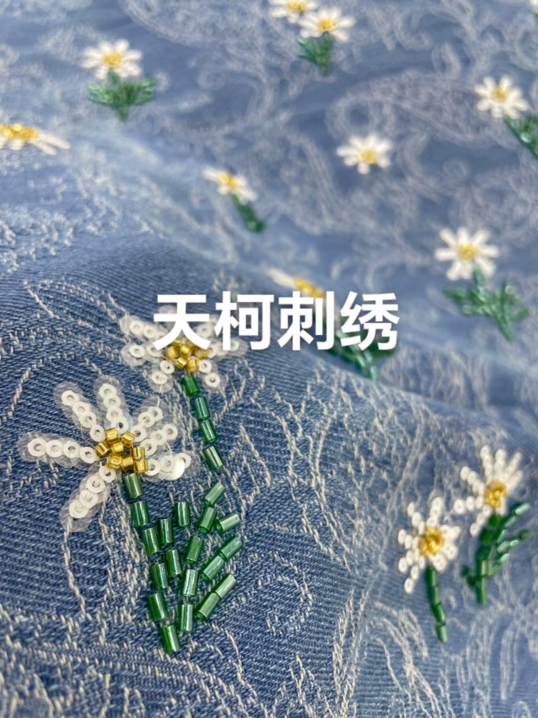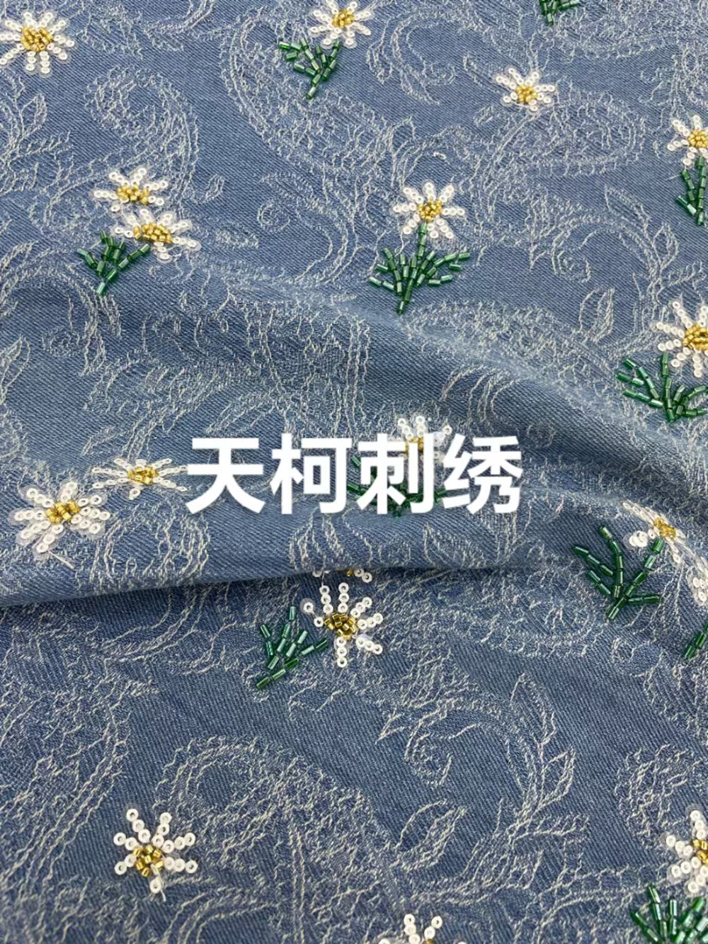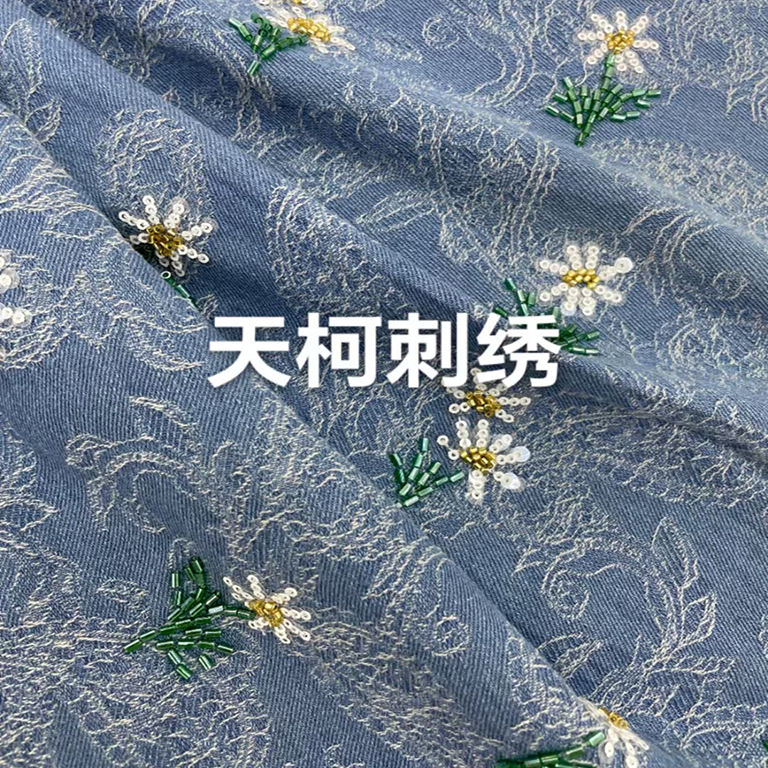 (TMC-E16414) Daisy Flower Made of Tube Beads and Sequins On T/C Cotton Jacquard Fabric