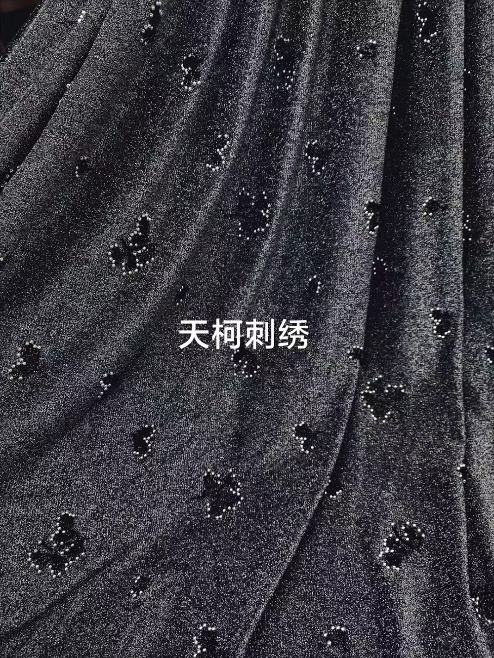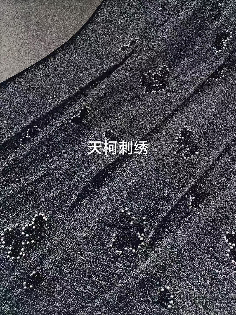 (TMC-E16452-E) Pearl and Tube Beads Embroidered Flower Design On Knitting Silver Lurex Fabric