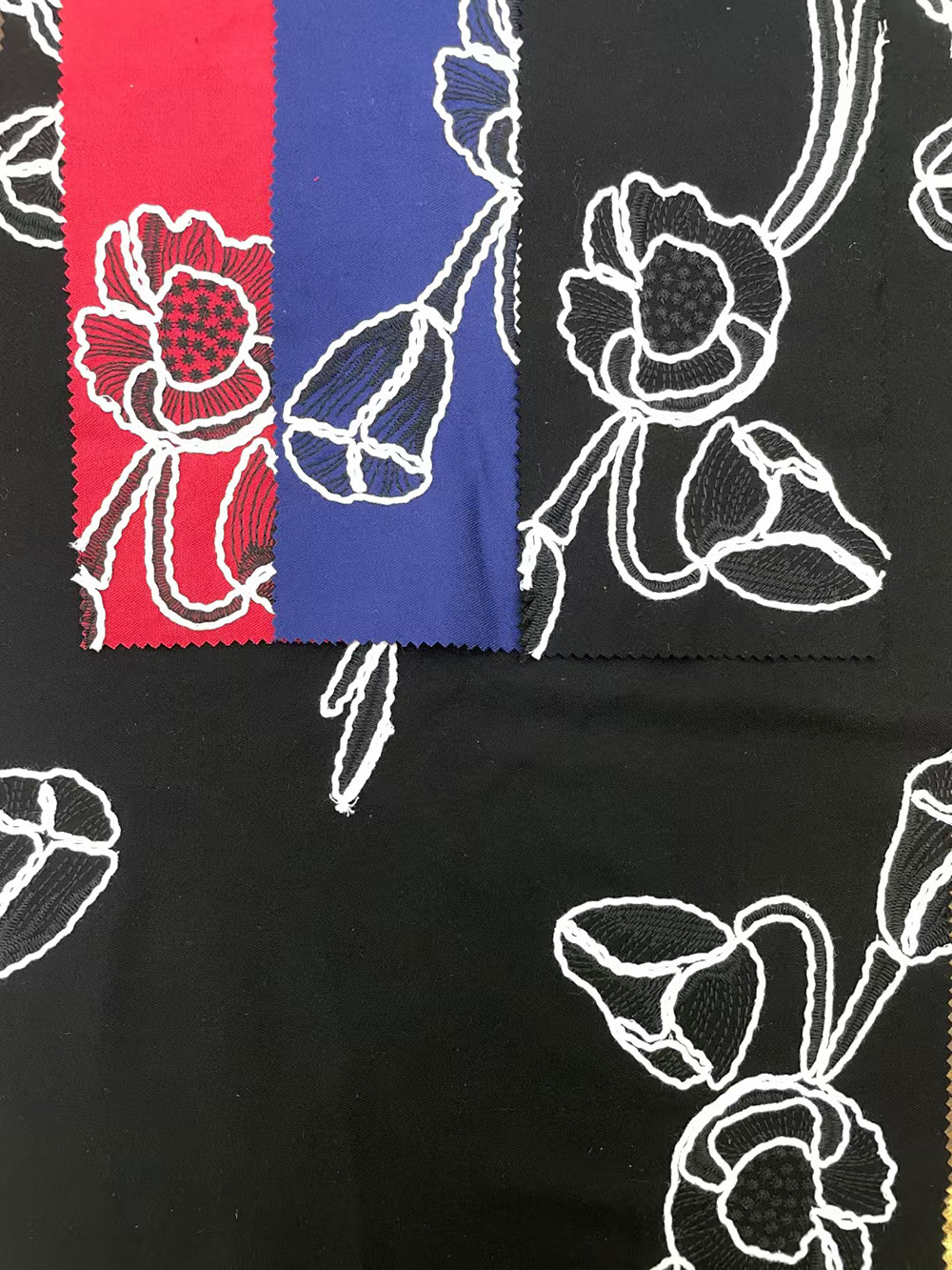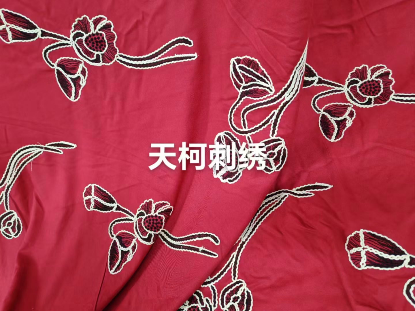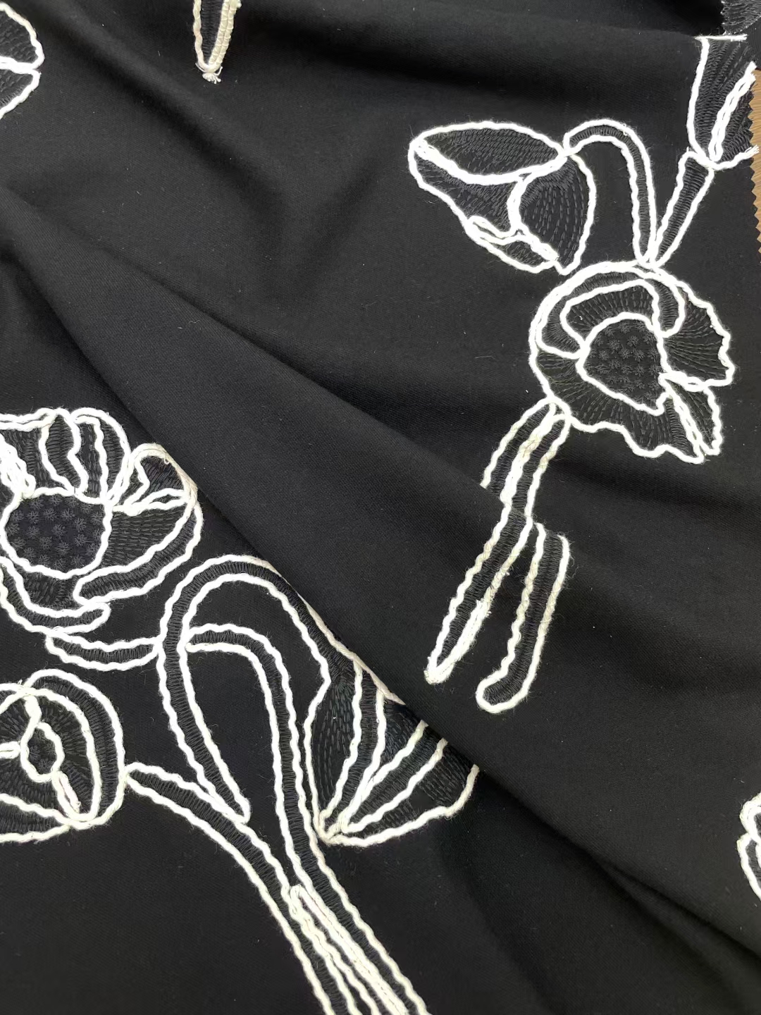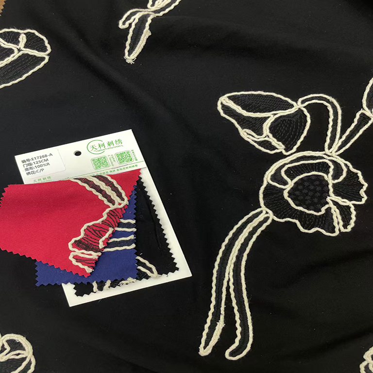 (TMC-E17268-A) Fine Poly Yarn Outlne With Thick Cotton Yarn EMB on Rayon Base Fabric