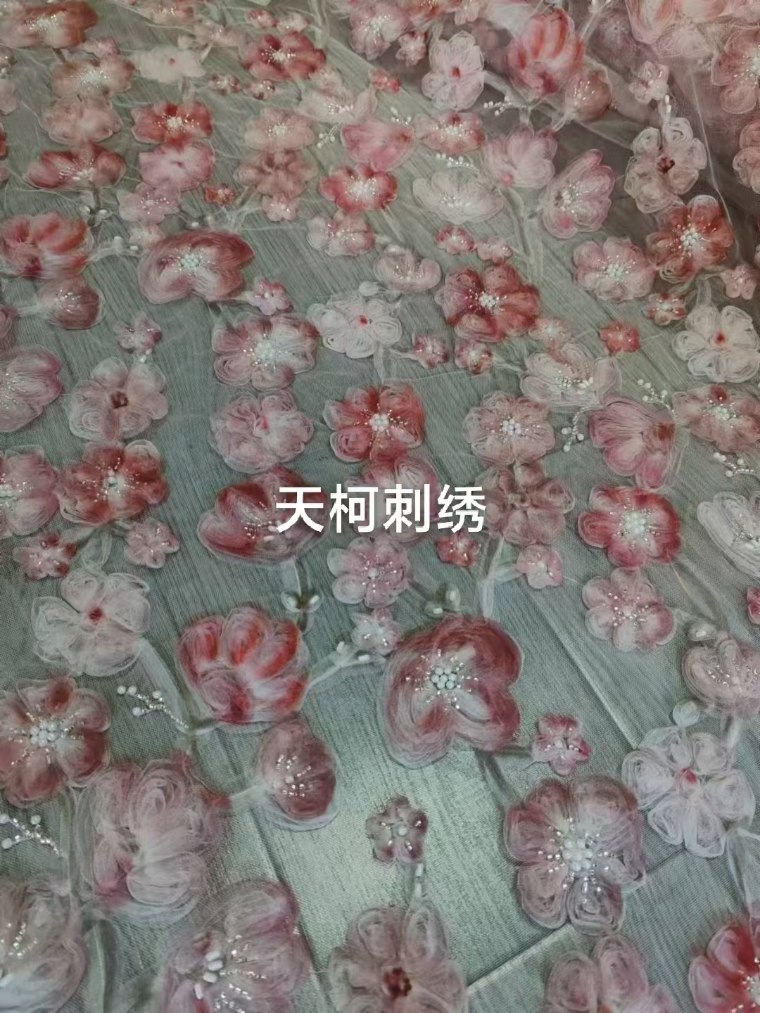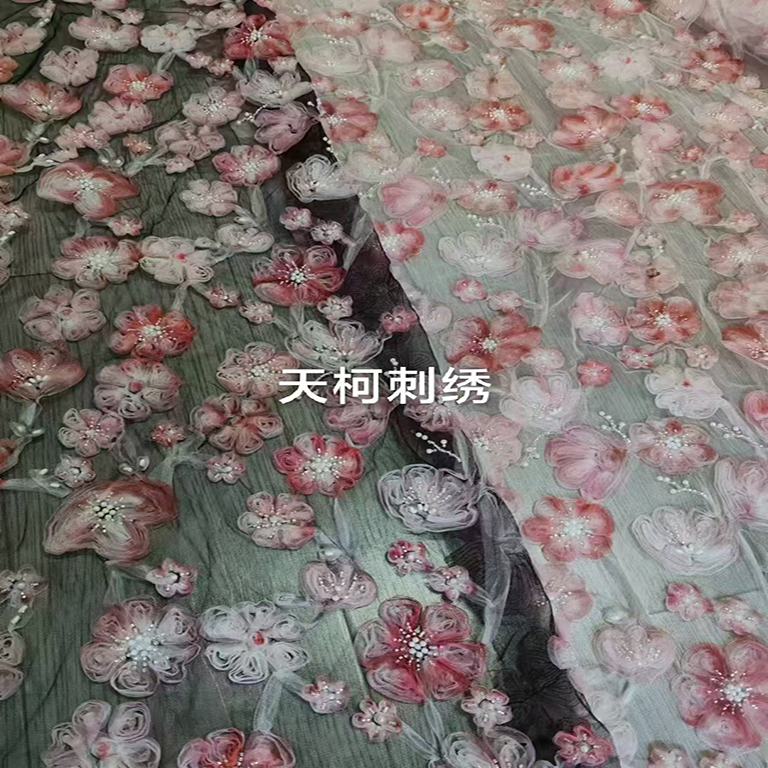 (TMC-E17735) Digital Printed Ribbon Embroidery With Tube Beads and Pearls on Tulle Mesh