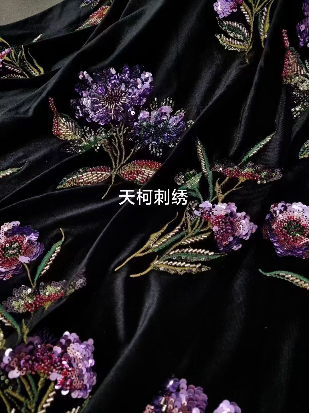 (TMC-E17830) Multi Color Sequins & Tube Beads Embroidered on Black Knitting Velvet