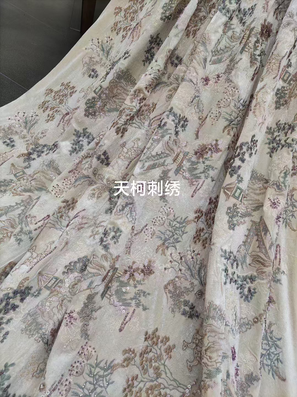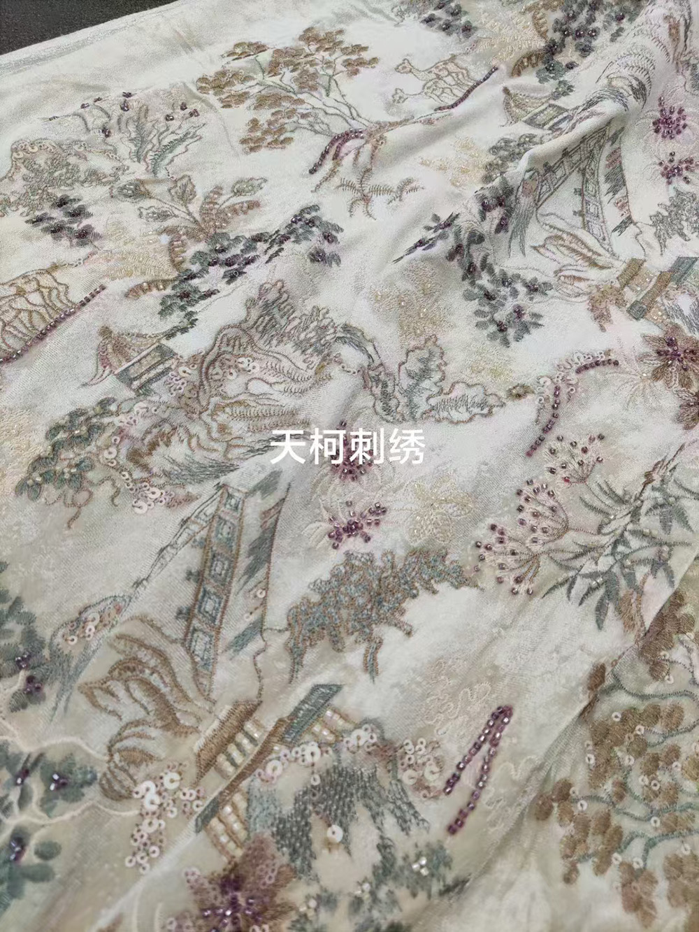 (TMC-E17831) Sequins&Tube Beads Embroidery on Beige Knitting Velvet