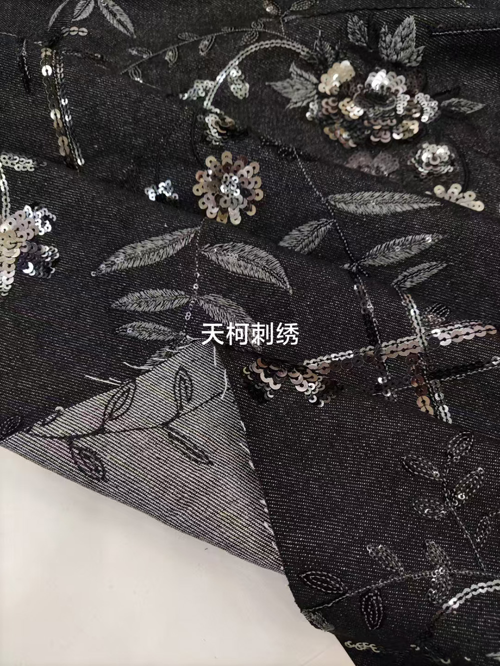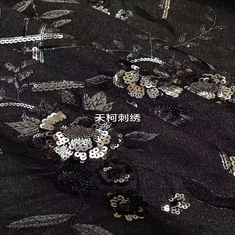 (TMC-E17935) Sequins&Tube Beads Embroidery on Black Denim